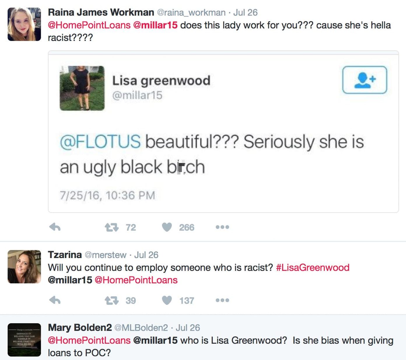 We must say that Michelle Obama is a classy, beautiful and stylish woman, and immediately earns respect for her elegance and grace. The woman behind the @millar15 Twitter account left a disturbing and unnecessarily rude and racist comment. What makes it a bit hilarious, is she used her full name on her account, so now we all know that Lisa Greenwood was the one behind the offensive post. Not very smart, huh? Shortly after the tweet, there was a statement from the woman’s employer, Home Point Financial, that Greenwood was no longer a part of the company.