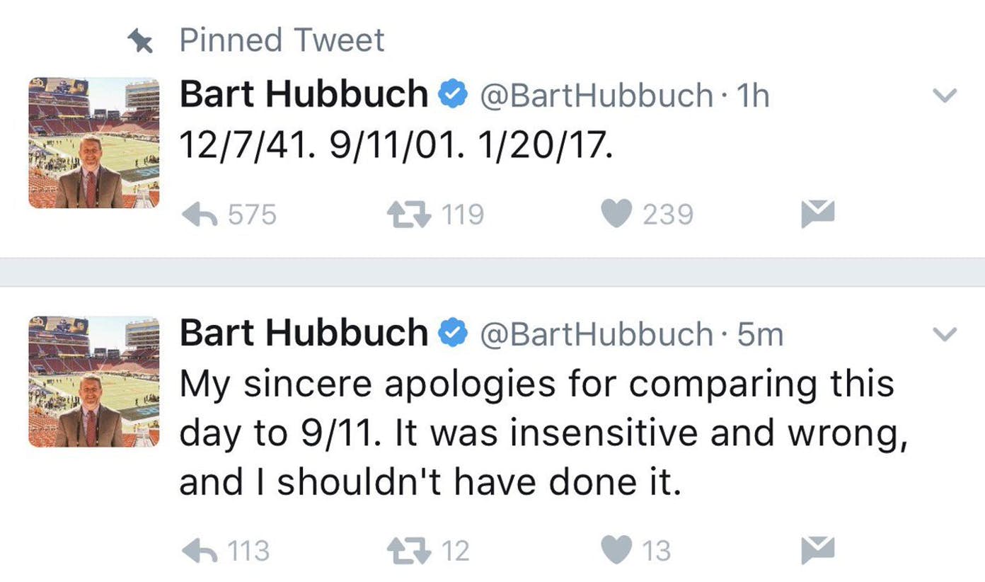 Many Americans could not accept that Donald Trump was the next U.S. president and that did not change even on inauguration day. When the election results were announced, it all seemed like a bad joke at first. That feeling is still alive today and it is like a bad dream you cannot wake up from, but this is not the point here. Bart Hubbuch is clearly one of those people and that is probably why he decided to post a very short, but rather awkward tweet that compared the day Trump was sworn to be the next president to the 9/11 terrorist attack and to the tragic events in Pearl Harbor during WW II. Hubbuch was immediately fired from the New York Post after the tweet.
