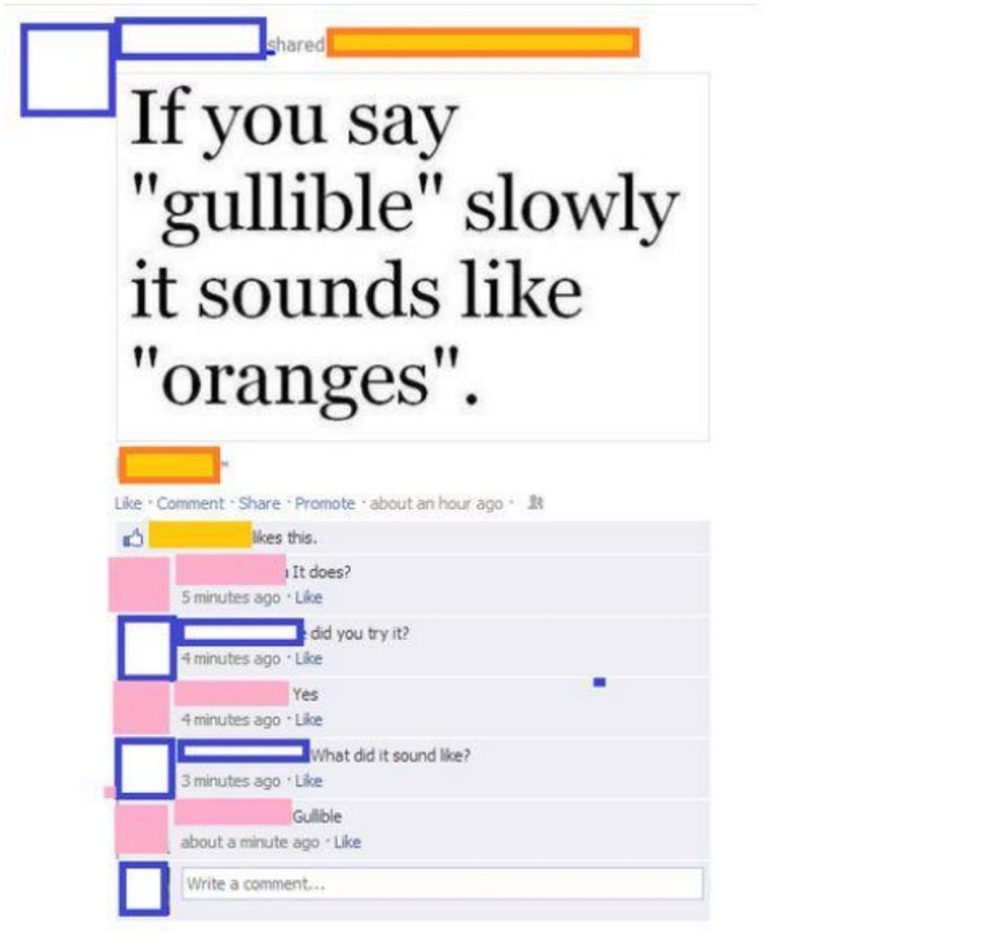 In case you’re wondering—the word “gullible” does not sound like the word “oranges”. According to one Facebook user, however, the words sound alike—or at least they did to him or her, until numerous other users pointed out that the words really don’t sound even remotely similar, even if the word gullible is spoken slowly. You kind of have to worry that the poster had a pretty serious inner ear infection at the time of the post. If that was indeed the case, he or she should have gone to bed instead of logging onto Facebook.
