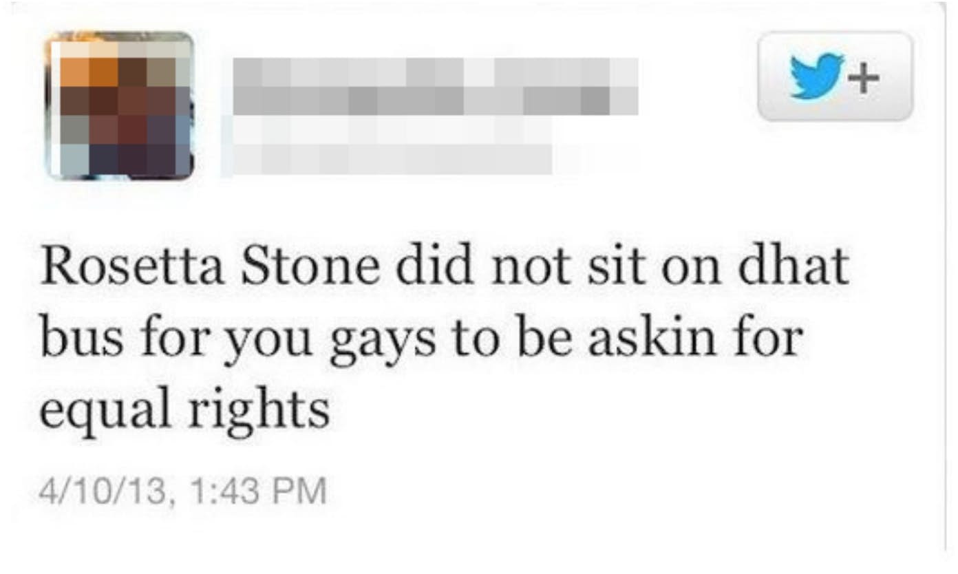 One Twitter user, offended about goodness knows what, claimed that “Rosetta Stone” didn’t give up her seat on the bus so that “gays” could be asking for rights.