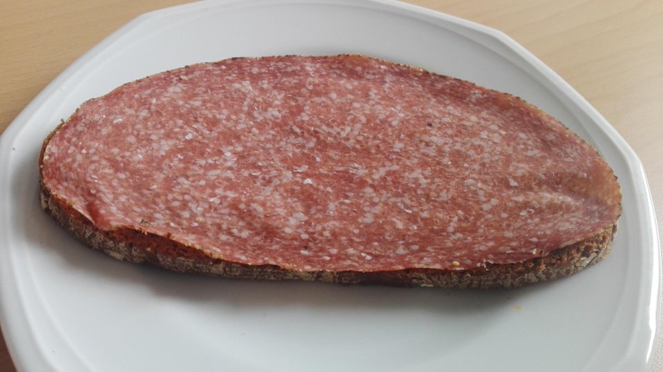 Well, this image might not look like much, but it offers something that cannot be seen every day! In this case, it is as simple as it can get! Someone put a slice of salami on their toast and it was a perfect fit!