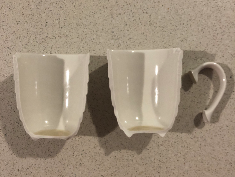When something breaks, it usually is ugrlier than it was before, but not in this case. Someone dropped their mug and it broke just any other would, but not quite! It was split into three perfect pieces!