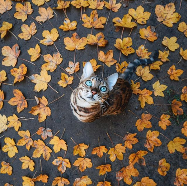 Here is an example of how a single image could feature tons of beauty! First of all, the cute cat and its eyes are definitely what makes the image exceptional, and the arrangement of the leaves creates a stunning pattern!