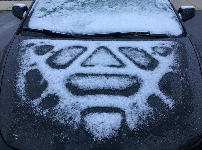 Here is something that happens for a certain reason, and it looks cool! The symmetrical pattern in which the snow melted off this hood is due to its underside. The heat from the engine melted the thinner areas first.