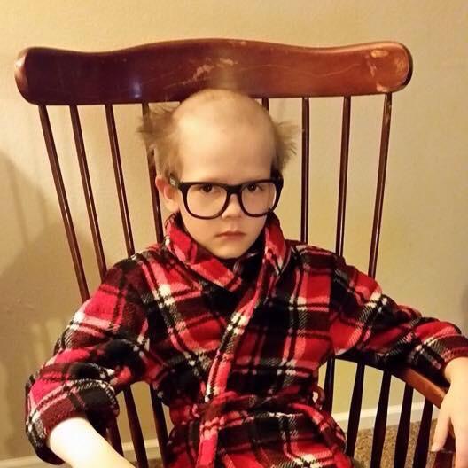 He dressed up as a 100-year-old man and even got the hairdo to match. He probably amused his whole family with this idea!