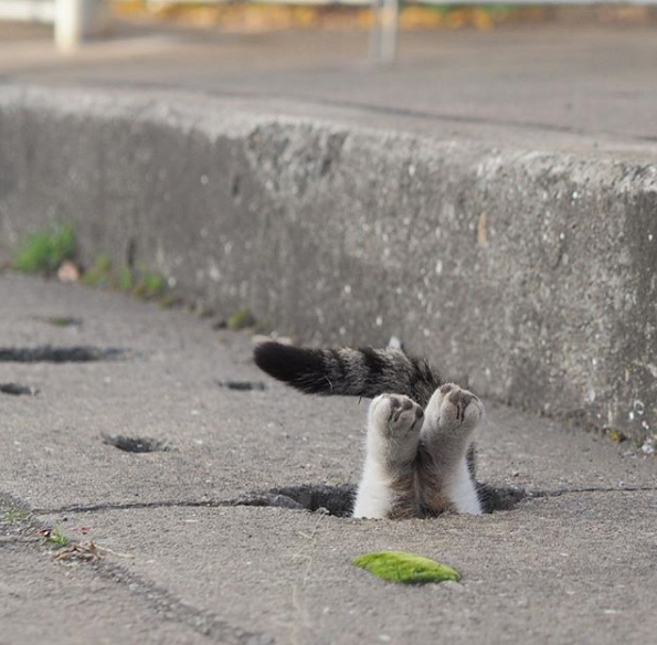 Maybe this cat found something in the bottom of that hole so it went whiskers first!