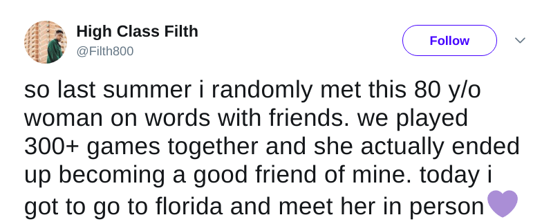 A young rapper from New York and an 81 year old woman from Florida became close during 300 games of Words with Friends. Rosalind Guttman used the word phat, which is pretty much slang for excellent or highly attractive. Most people don’t use it anymore at all. 22 year old Spencer Sleyon was impressed that she knew it and asked her about it, which started regular chatting between the two, and a friendship blossomed between the pair.